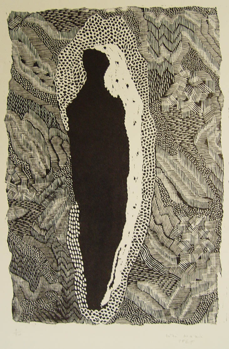 Centrally black figure framed by white, while in the background geometric patterns are created in black and white.