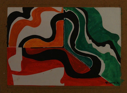 The project is divided into three parts. Each one is dominated by different colors: green in the right part, orange in the upper left rectangle and red in the lower left part. The colors are divided by black checkered stripes while there are also uncovered sections of white paper or pasted. The work is bounded by a pencil rectangle. The surface is brown-yellow cardboard, hard.