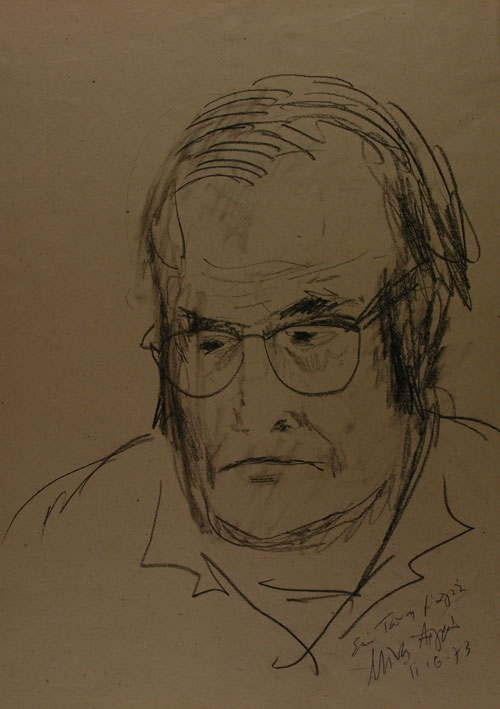 Portrait of Tonis Spiteris three-quarters to the left and shoulder height. He wears glasses and has a lowered gaze. She has a parting on the right and thin hair on the top of her head. The design is fast.