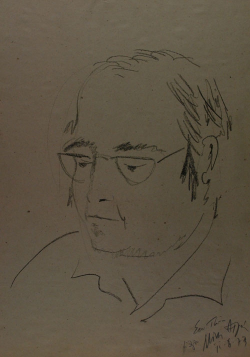 male figure (Spiteris) is depicted in a 3/4 view to the left. He wears glasses and has a lowered gaze. He has a parting on the right and thin hair on the top of his head. He is wearing a collared shirt.
