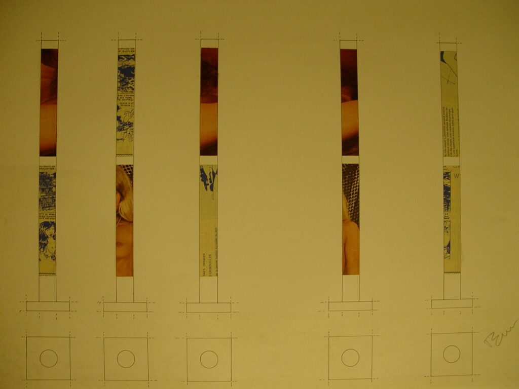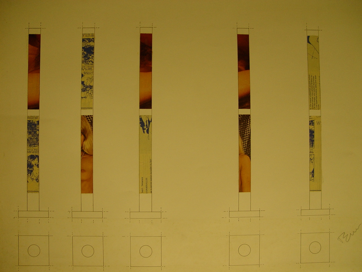 Five identical geometric formations consist of squares at the base and elongated rectangles at the top. The rectangular formations are covered with pieces of magazine pages, some of which are nude photos, while the rest are from comics.