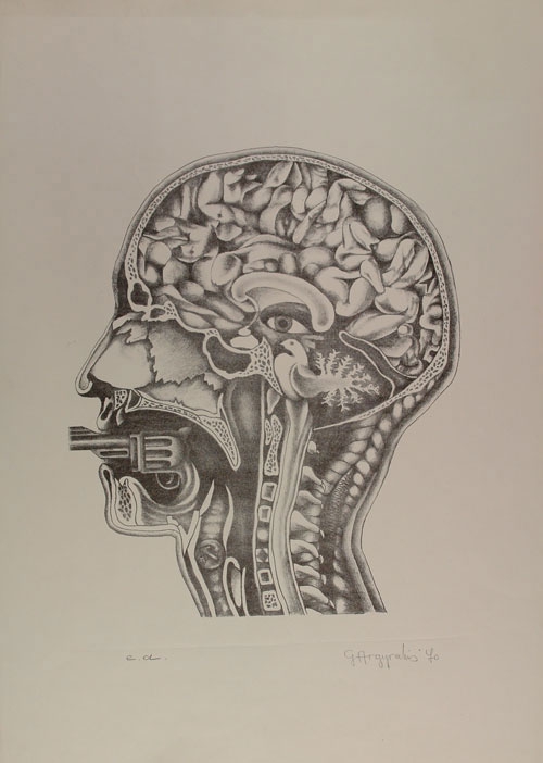 Brain in section is shown. In addition to the instruments, the artist renders a bird and an eye above. A gun protrudes from the mouth hole. The vertebrae end in claws. Intense symbolism.