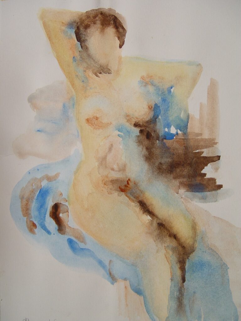 Female nude seated with left arm raised and folded back. The right arm is extended to the right and is bent at the elbow. The features of the face are absent, while the form is shaped with pink colors. The space is rendered vaguely around the figure with light blue and brown colors.