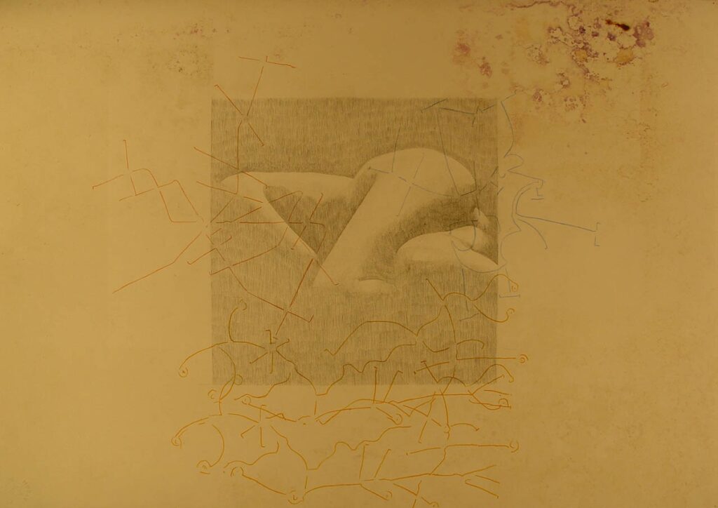 Inscribed in a frame with overpaintings of abstract designs. A female nude is depicted lying on the left side of the work. The nude is captured from a close distance, the head is not visible. On top of the show are painted abstract designs red, blue and orange lines that create three corresponding sets.