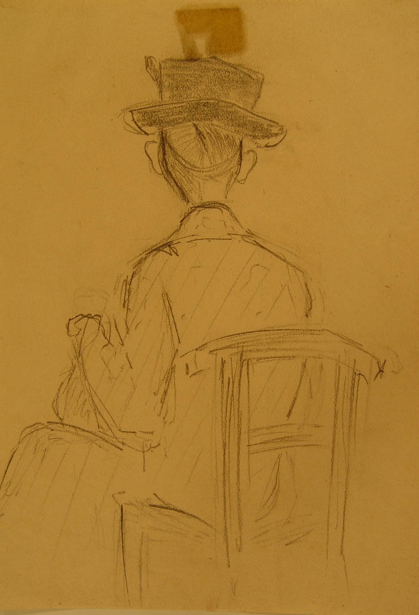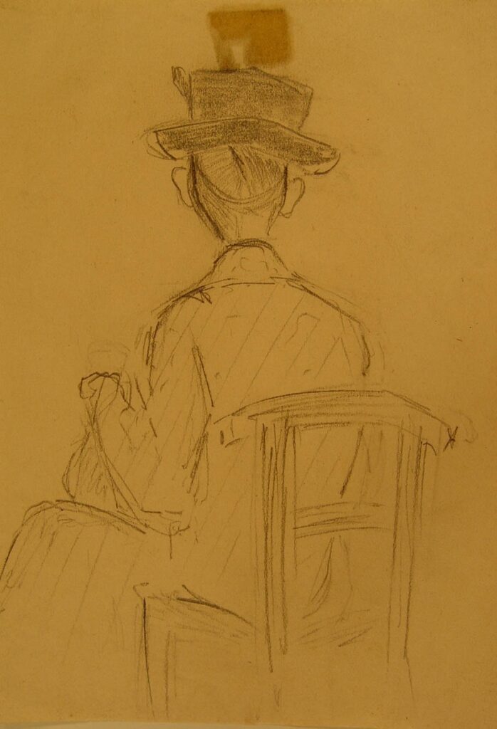 It is attributed to a seated female figure with a hat and a bent elbow of the left hand. Shown is the rear view of the figure turned 3/4 to the right, the back of the chair and the seat.