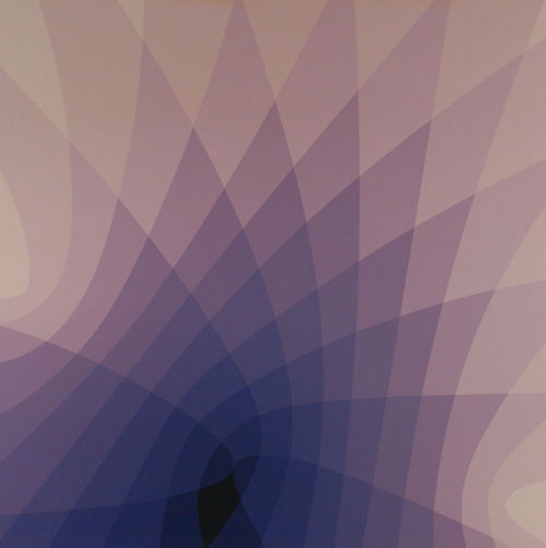 The work depicts a geometric composition based on curved lines, which start from the left and right sides of the work. These lines intersect at various points and are tangent at others. In terms of color, the work moves to shades of purple. Composition elements are reminiscent of low-resolution digital image pixels.