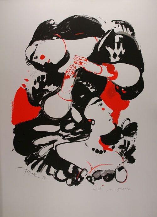 Two female busts are depicted in profile. One figure stands in a vertical arrangement above the head of the other. Black and red dominate. The work is readable along the vertical as well as the horizontal axis.
