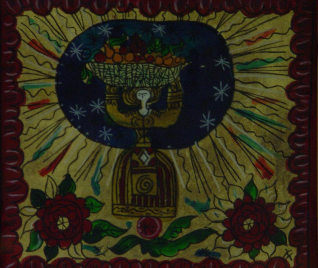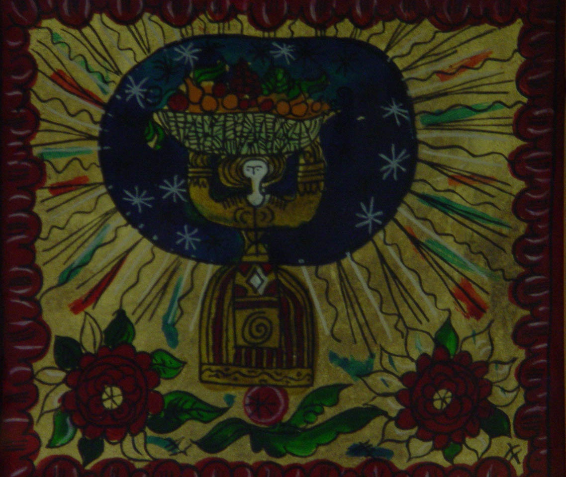 female figure is depicted frontally in the center of the representation. On her head rests a large basket of fruit. From the torso of the figure upwards, a blue frame is created in the work, while the rest of the background is gold. The golden background is surrounded by a red frame with geometric decoration. Two large red flowers are attributed to the two lower corners.