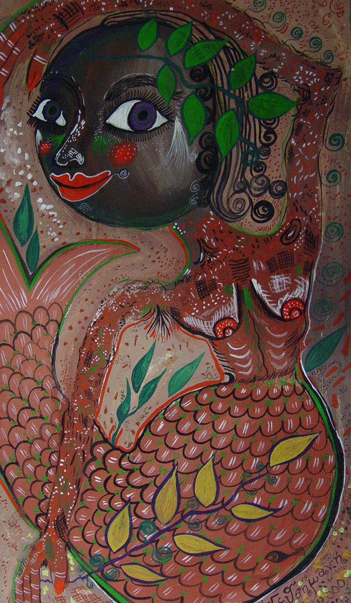 Centrally depicted is a mermaid with strong physiognomic features and a strongly twisted body. . In her hair is a green branch with leaves. It is surrounded by strongly stylized geometric and floral decoration. Shades of brown and green dominate the work.
