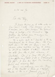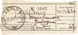 Bespectacled mermaid facing 3/4 left. She has green eyes and two branches come out of her mouth. A yellow ribbon stands out on the left. Strong floral patterned decoration.