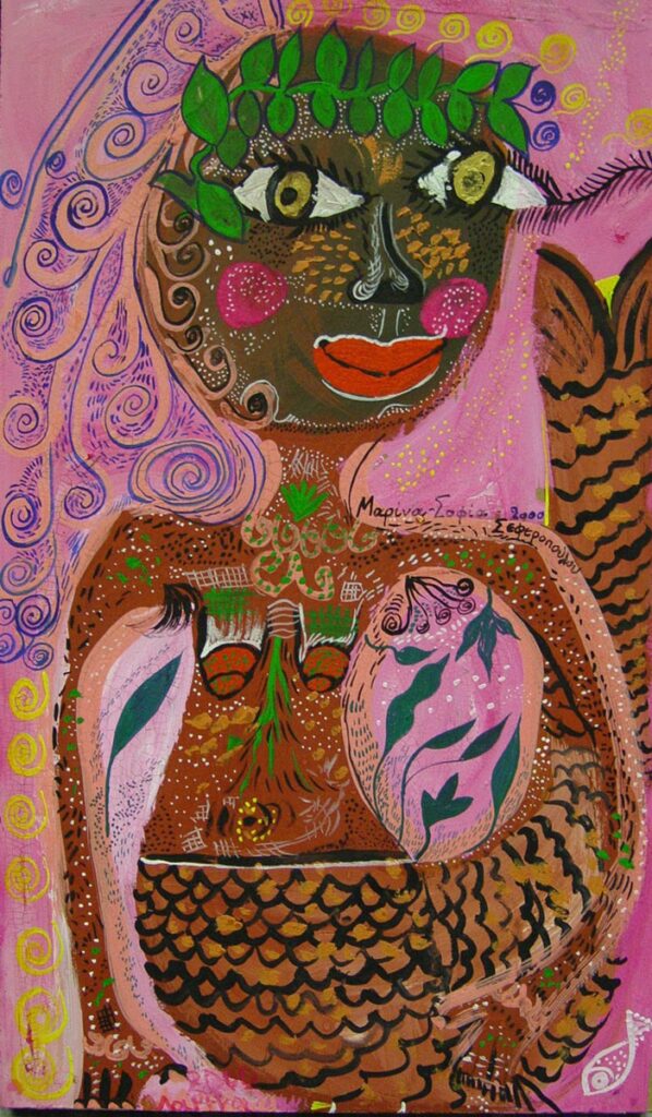 It depicts a mermaid, with strong physiognomic features, large eyes and lips. The background is pink, while the body of the figure is in shades of brown. Vegetal stylized motifs above and around the figure.