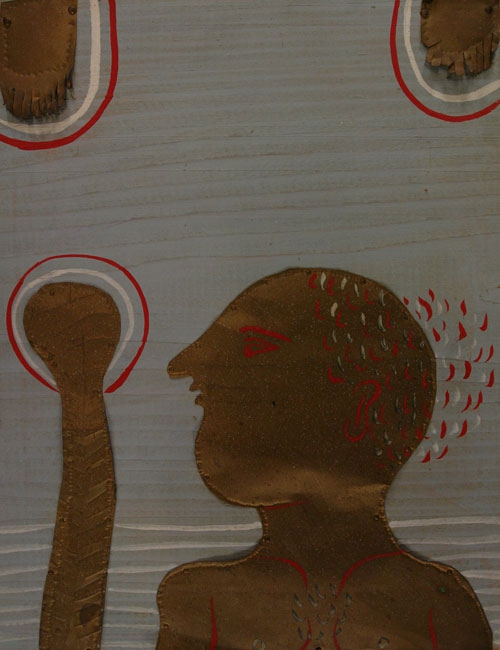 The composition consists of glued copper elements on a piece of wood. A stylized human figure is rendered in profile, central to the work. In front of her is a microphone, stylized. In the upper part, on the left and right, semicircular formations with fringes develop. Traces of red and white are used to outline the shapes and anatomical features of the figure. The background is light gray. In the lower part of the work, nine white lines can be seen, parallel to the base of the work, starting from it and reaching the height of the neck.