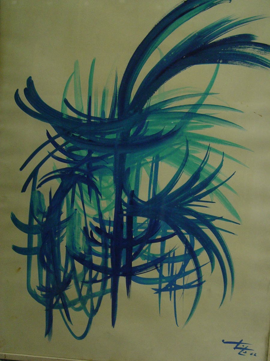 This is an abstract monochromatic composition. From the center of the composition, blue strokes emanate with endings in various directions.