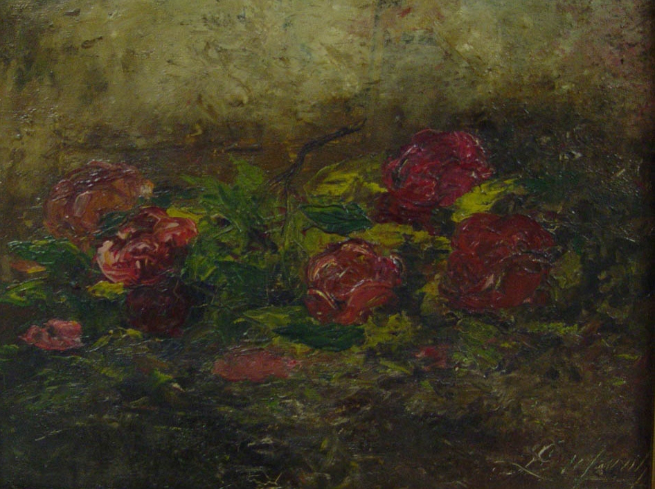 A bouquet of roses is depicted. We distinguish the red flowers and the green stems. The color is embossed, while the background is undefined and structured with shades of brown.