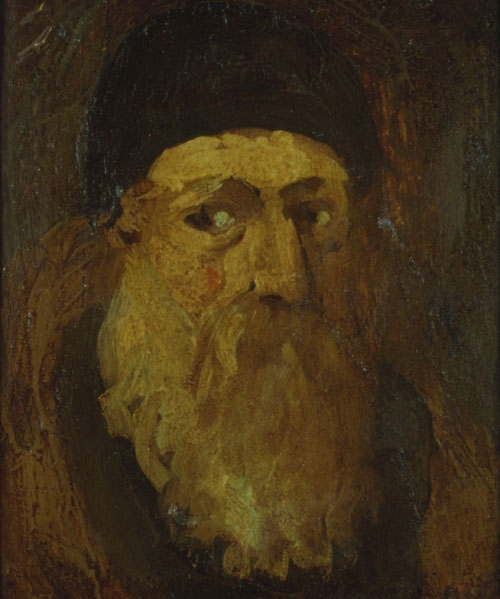 Depicted bearded man standing 3/4 to right. His gaze is directed to the left. He wears a cap, probably the insignia of a Catholic priest. The background is undefined. In terms of color, the work moves to shades of brown.