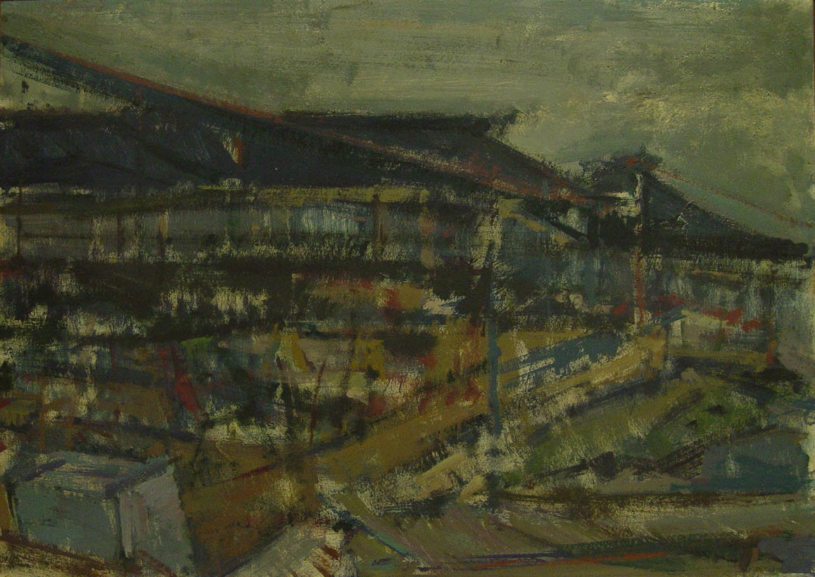 brownish corridor can hardly be distinguished, which extends from the lower left to the right in the center and is lost in a mixture of colors. At its starting point there is a grayish house. With the exception of the upper part of the work dominated by shades of blue, in the rest of the painting there are various colors mainly brown, red, green and blue, intersecting in random combinations.