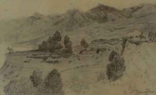 A hill with trees and a house with a gabled roof on the right side are attributed to the first level. On the second level, mountain range.