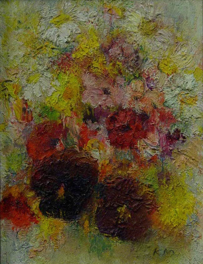Depicted abstractly in a close-up of flowers. The color is embossed. Shades of red, yellow and green dominate. The surrounding area is left undefined. Removes painting material, scraping the color, giving a sense of intimacy.