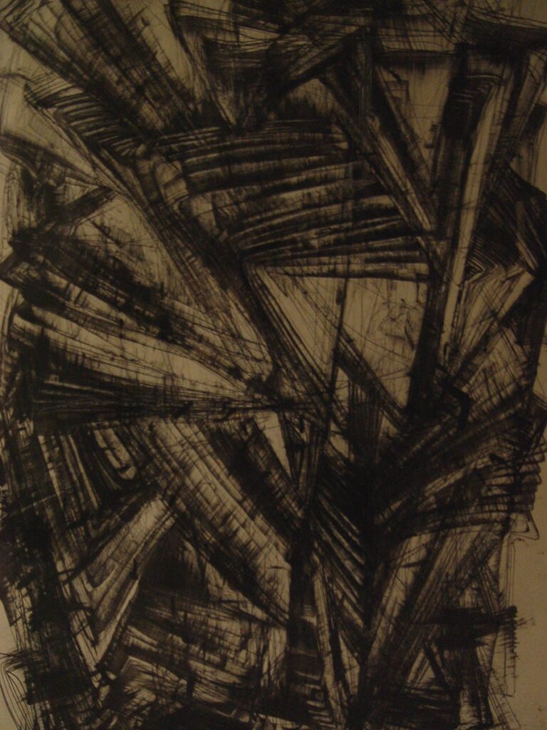 The performance consists of fast lines in various directions, suggesting a geometric structure. However, it may be possible to distinguish superimposed triangular formations presented as a sculptural development.