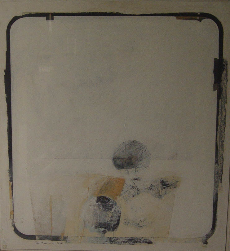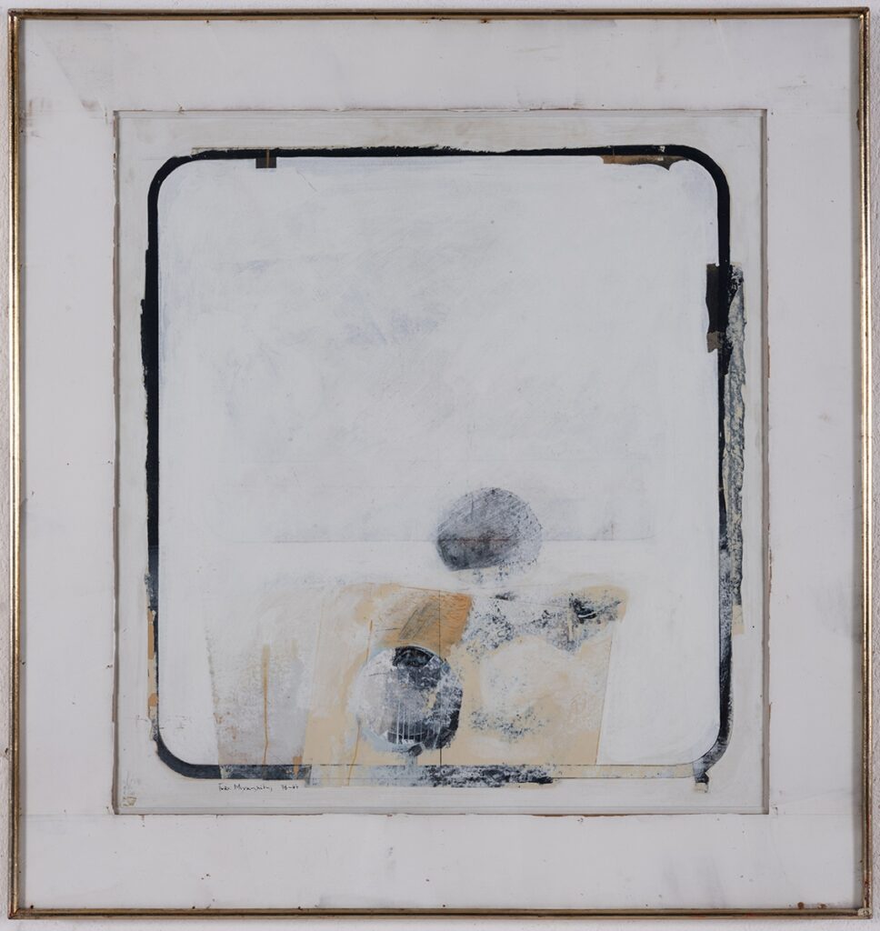 Abstract composition. On a white background, which dominates the show, two circular gray figures are depicted, central to the composition. The lower formation surrounds a rectangular yellow-off-white shape. The outline of the show is highlighted by black-gray tape. Black, yellow and orange complete the composition.