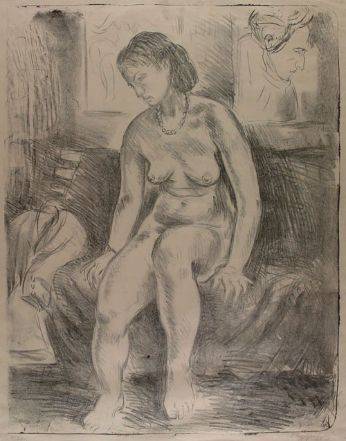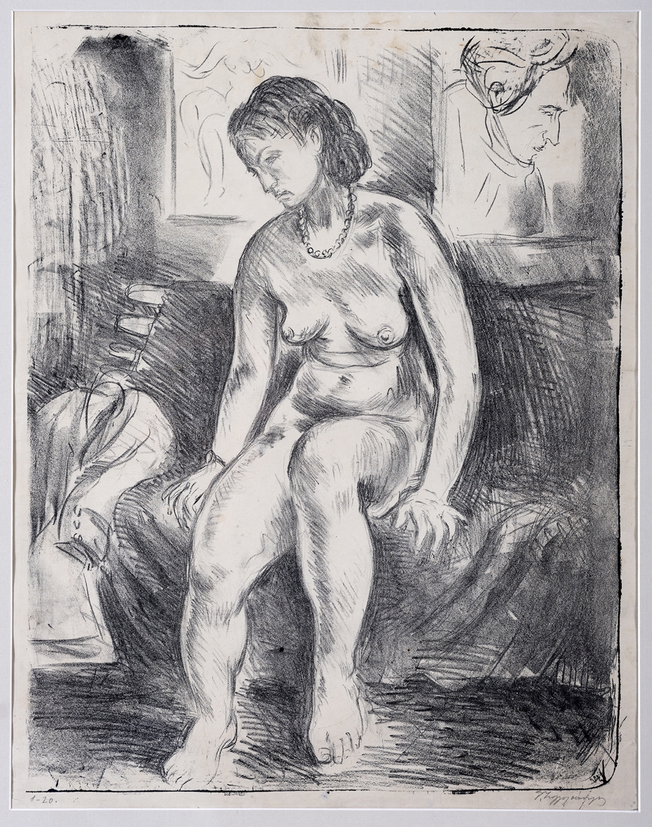 It depicts a naked female figure, with the face rendered frontally and the body in three quarters, sitting on a couch. The woman with bowed head wears a watch and a necklace around her neck. To her left, a jacket is thrown. On the wall behind her are two posters, a female nude and a male profile portrait.