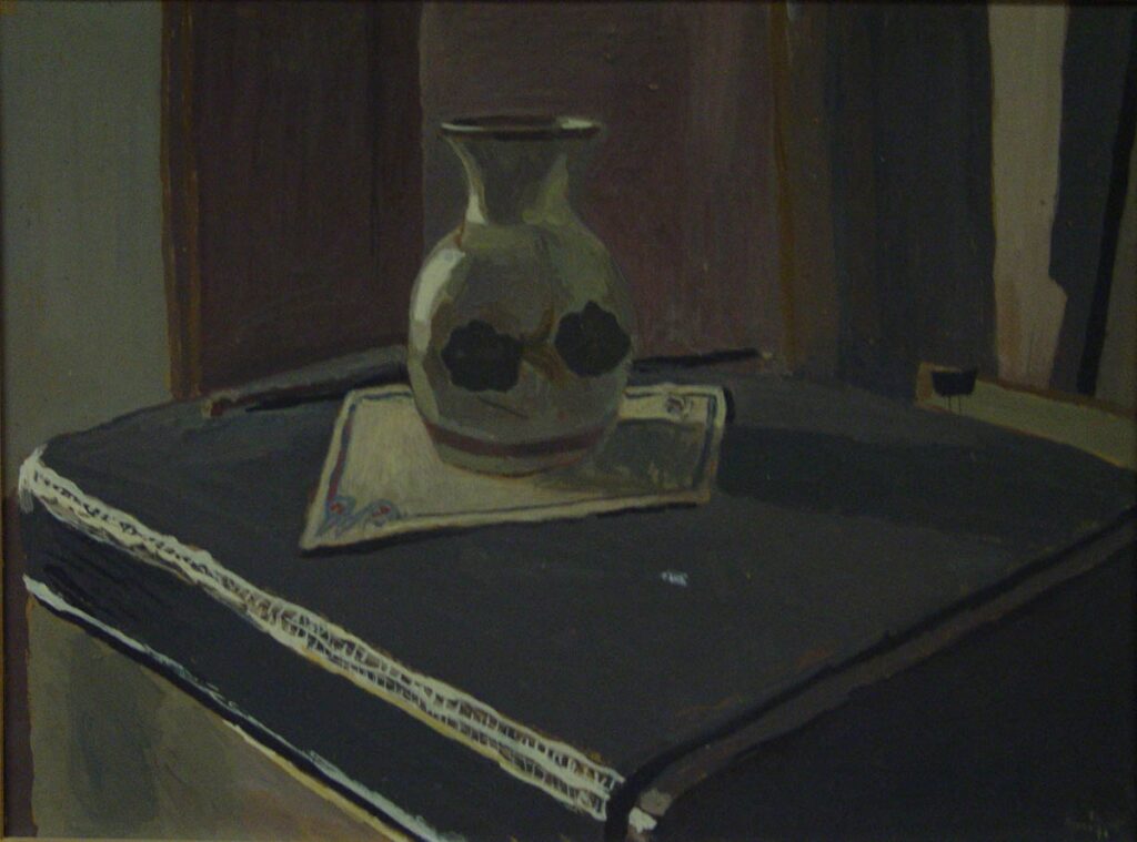 Table with a dark tablecloth and embroidery where it corners on the surface. Small square napkin on the table, decorated with floral elements. On it a vase with two large flowers in the face. The colors of the work are dark.