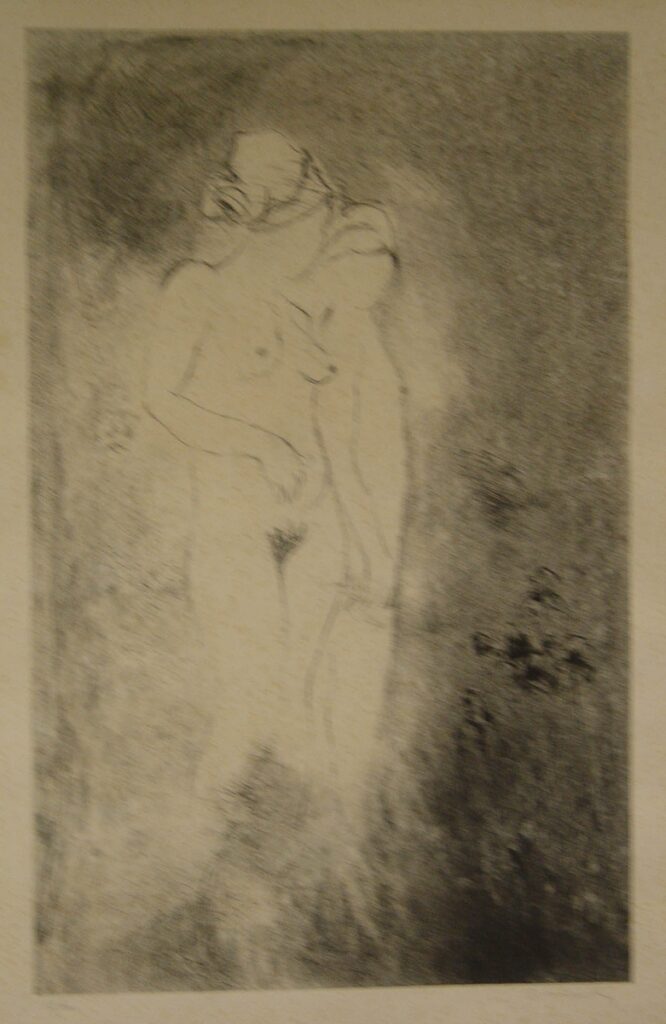 Two nude figures are depicted walking in a garden. The first is a woman (body 3/4 to the left-face 3/4 to the right) with particularly emphasized gender characteristics. The rear figure is male, his head is turned towards the woman, while his right hand rests on the woman’s left hand. In the lower right, flowers are depicted, while the rest of the space is left undefined.