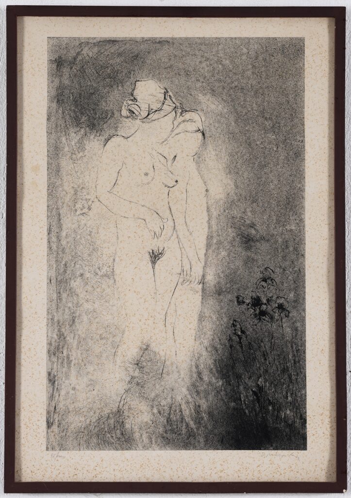 Two nude figures are depicted walking in a garden. The first is a woman (body 3/4 to the left-face 3/4 to the right) with particularly emphasized gender characteristics. The rear figure is male, his head is turned towards the woman, while his right hand rests on the woman’s left hand. In the lower right, flowers are depicted, while the rest of the space is left undefined.