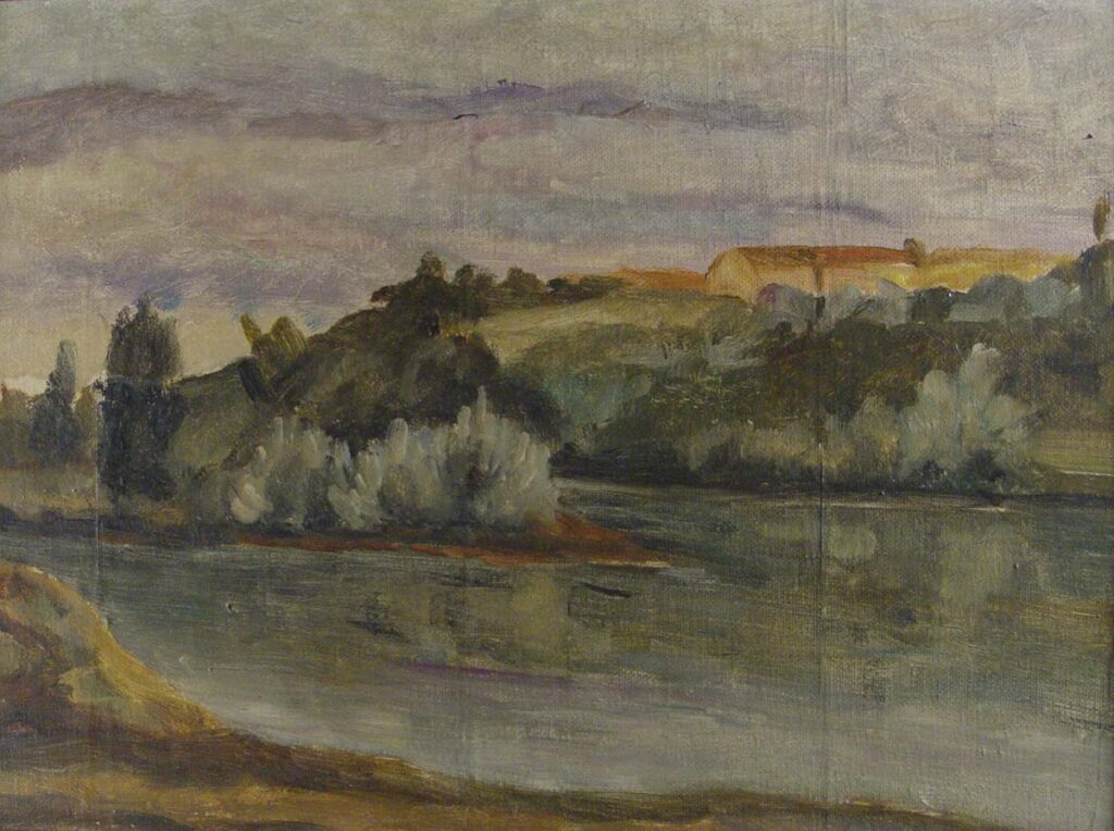 In the first level a lake is depicted, on its banks there is dense vegetation. A hill with houses can be seen in the back right. The upper part of the show is occupied by the sky, green and ocher dominate.