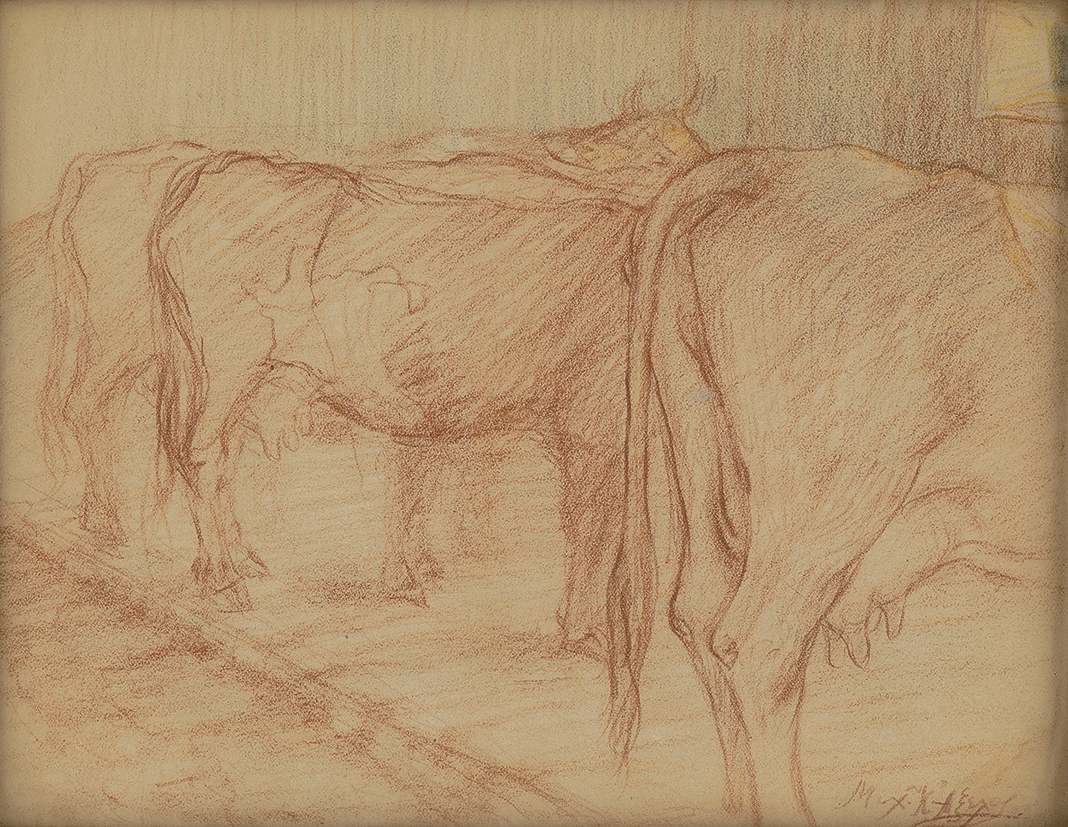 Depicted, in a diagonal arrangement, from right to left, are cows in a cowshed.