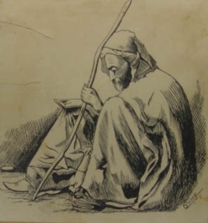 An elderly beggar is depicted seated, bent with right hand in alms pose and bacteria in left. He wears a kelebia and a sari, he is bearded and his eyes are closed. The surrounding area is stated in general terms.