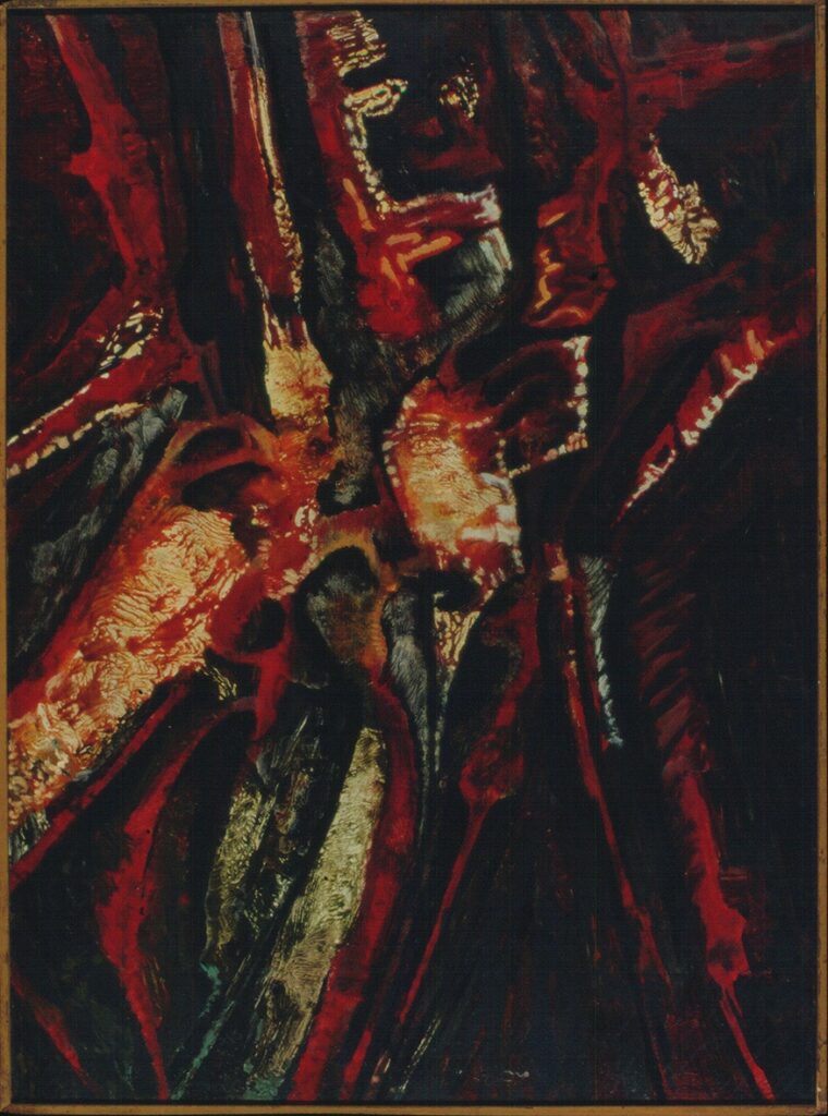 Abstract composition, based on the juxtaposition of black and red. Touches of grey, green and yellow can be seen in places, throughout the surface of the work. In the center is the red, which runs through the work from the top to its lower part, in a striped arrangement.
