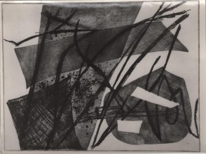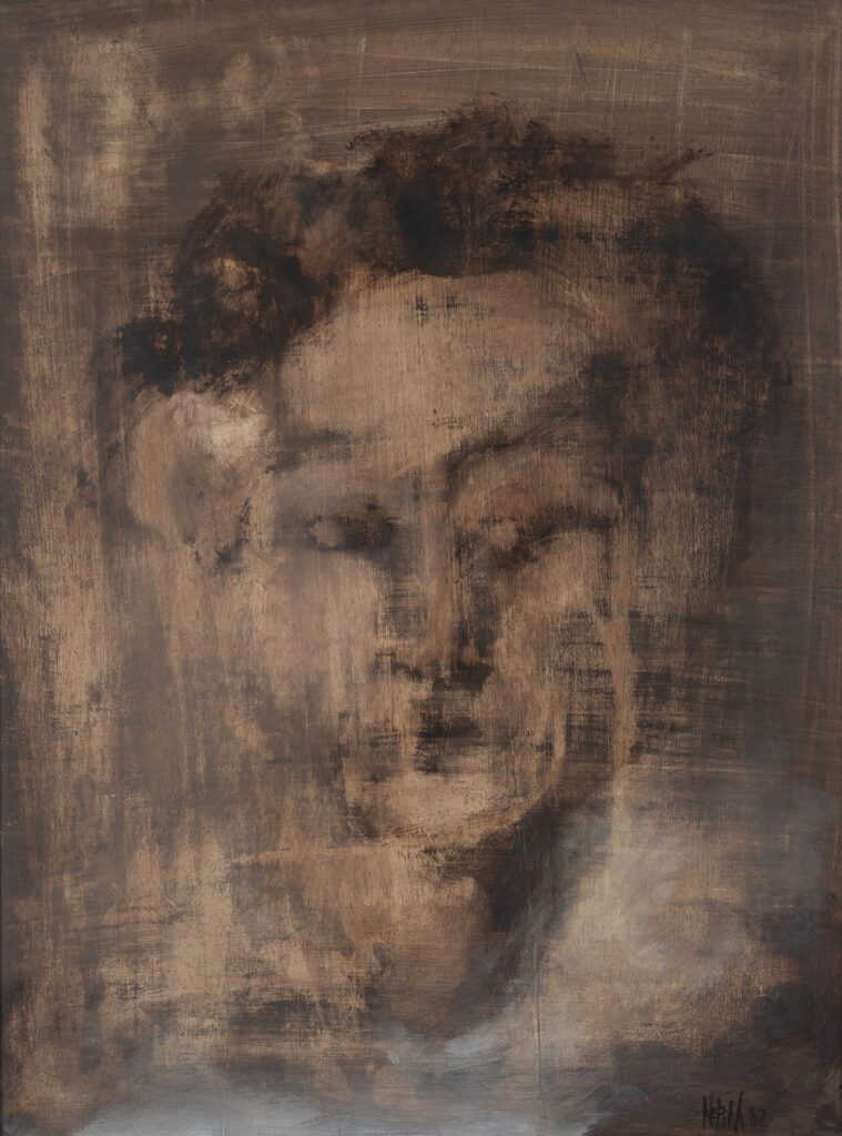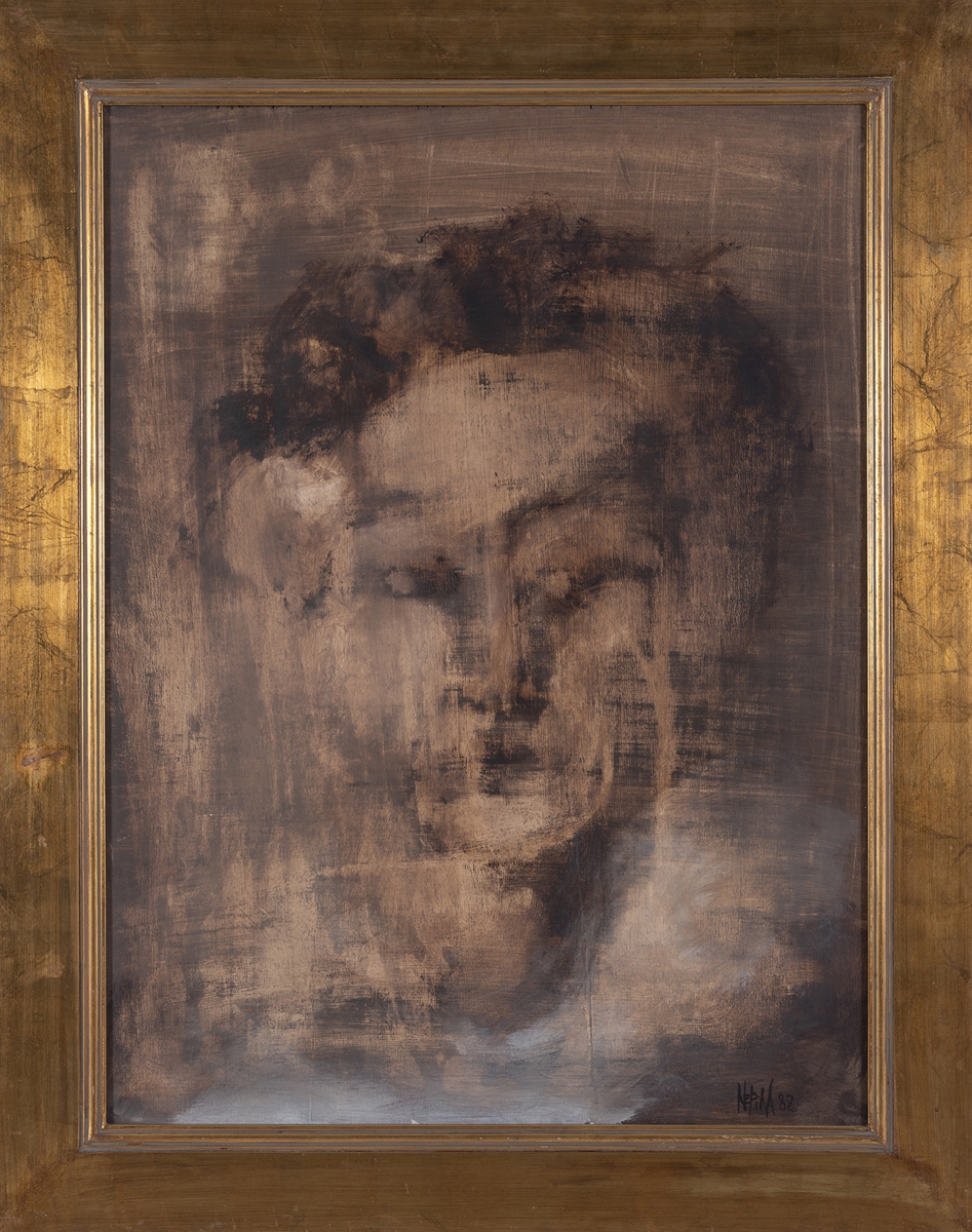 face is depicted facing forward with closed eyes. The color on the face and in the surrounding area appears as if it has been scraped off, so that everything is indiscernible (practice of intimist painters). In terms of color, the work moves to shades of brown, with the exception of a white formation in the central part of the painting.