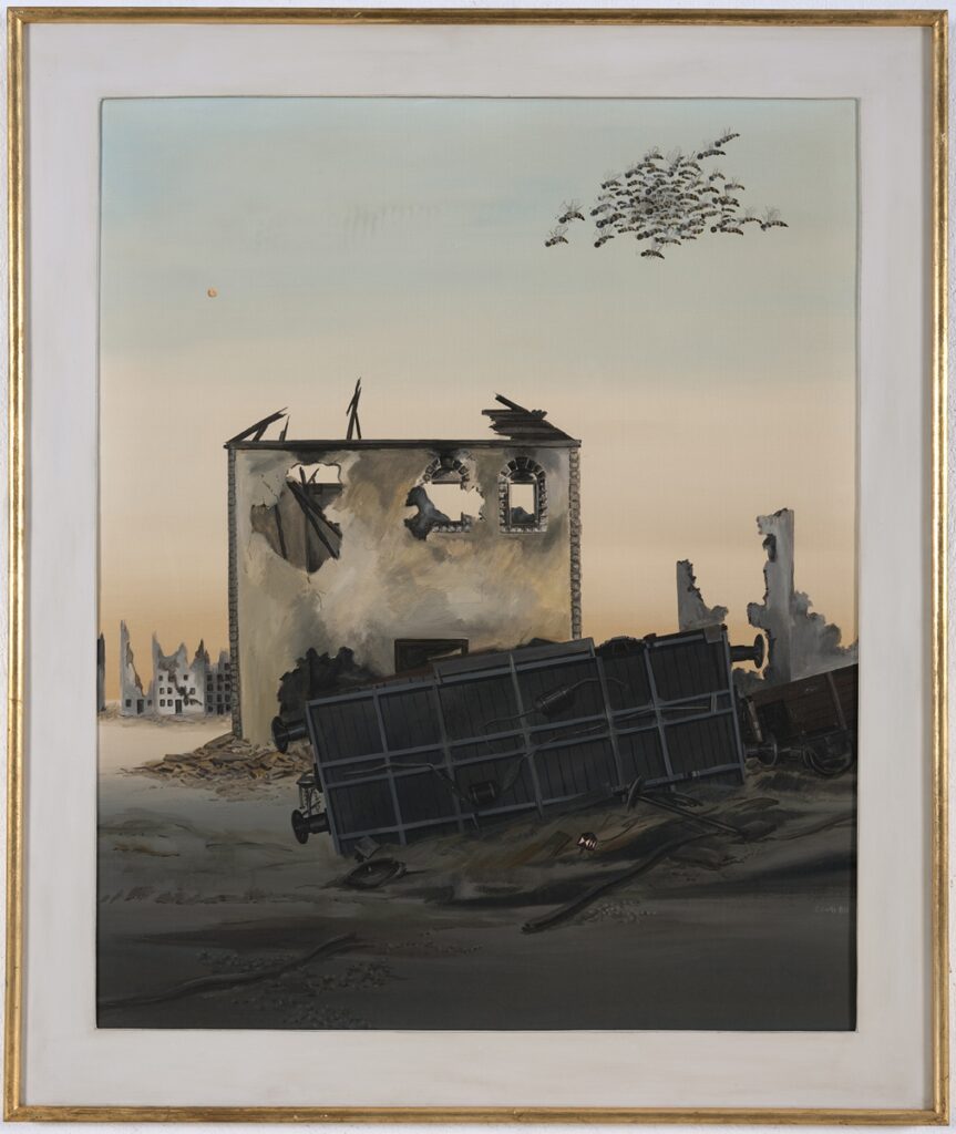Depicted are collapsed buildings, damaged train cars and a swarm of bees in the sky.