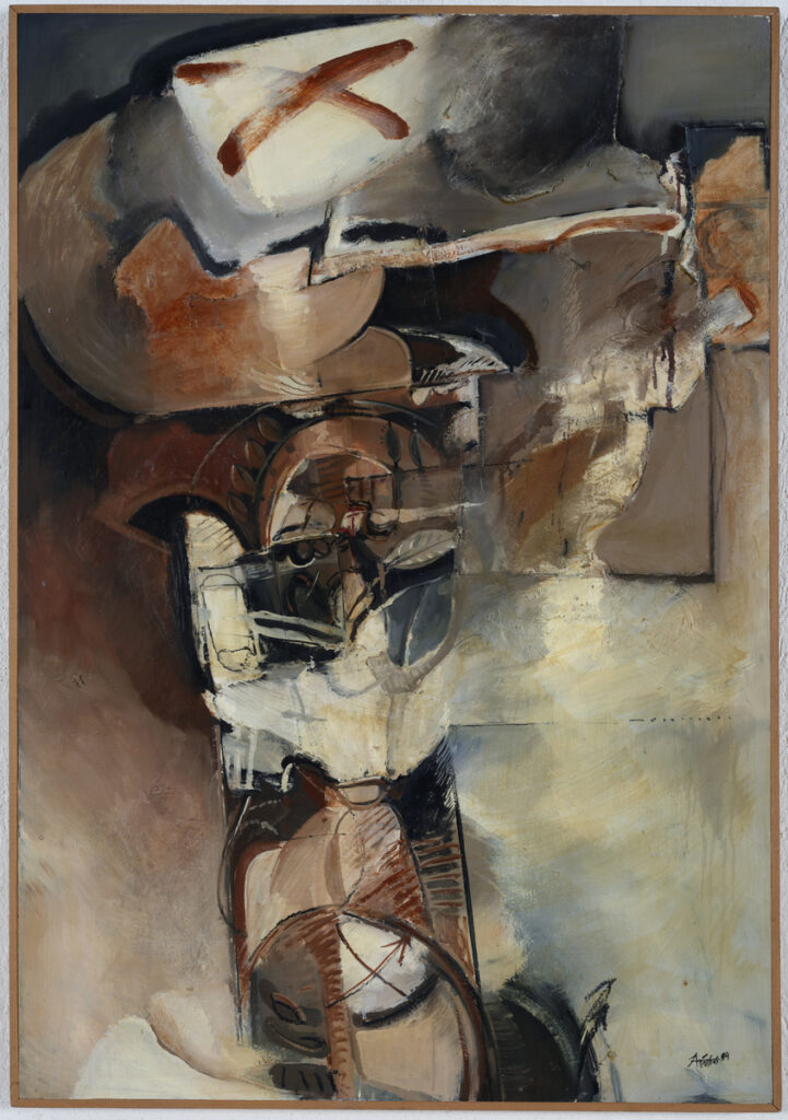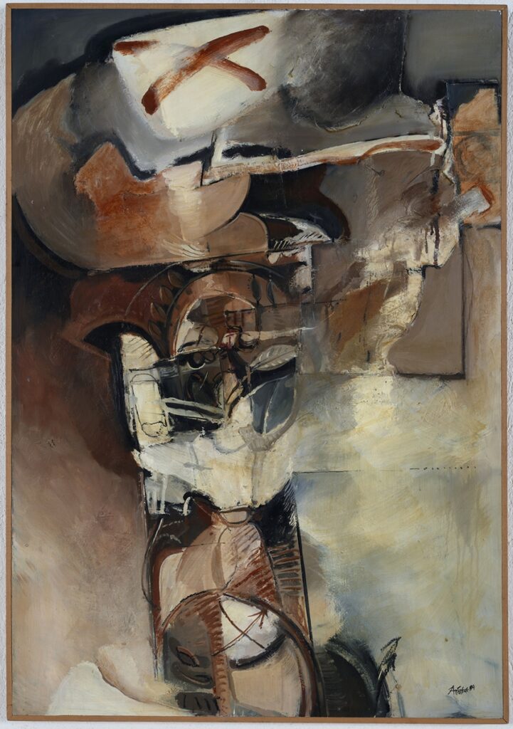 Abstract work with strongly embossed and pasted elements in a staggered development in tones of maroon and pale yellow. Approximately in the center of the composition, a horizontal formation is attributed, dominated by a yellow relief, an adjectival (pasted) element, which ends in a brown “X” shape, in a yellow background. The lower right side of the work is left in brighter colors (mixing yellow – gray).