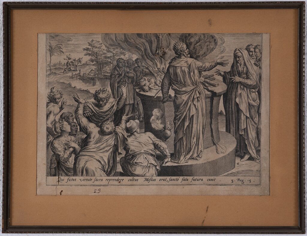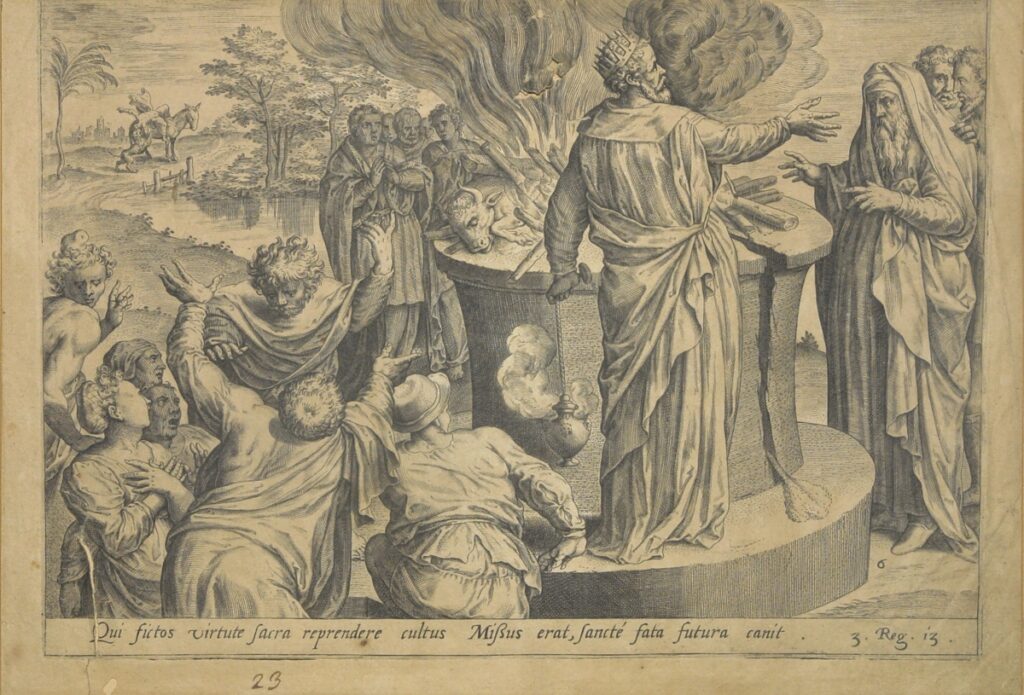 It depicts an episode from the Old Testament (Book of Kings 3, chapter 13). This book exists in the Greek translation of the Septuagint but not in the Latin Vulgate). It is about the pagan sacrifice offered by the Jewish king Jeroboam at Bethel. Jeroboam turns to the old prophet Josiah who warns him that the offering angers God. The ruler reacts arrogantly by demanding the arrest of the prophet. Then according to the words of the latter and for the punishment of the sacrificial Jeroboam the altar on which a bull is burned as a sacrifice. it opens and the ashes from the sacrificed animals come out. The people who attend the sacrifice, seeing the miracle are overcome with terror as shown by their intense gestures. The whole scene takes place in the countryside. The upper part depicts the punishment of the prophet Josiah himself because, disobeying God who asked him not to eat or drink anything in that place, he dines in the house of another prophet. On his way back to Judea, a lion throws him off his donkey and kills him.