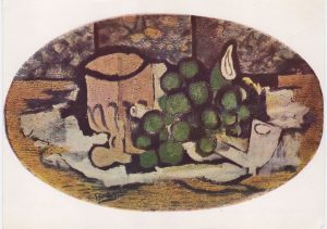 table with a vase and flowers is depicted. objects are rendered generically with quick, sharp strokes of pure color. The dominant colors are red, brown and purple. Elliptical space, nervous touch, power of color submission.