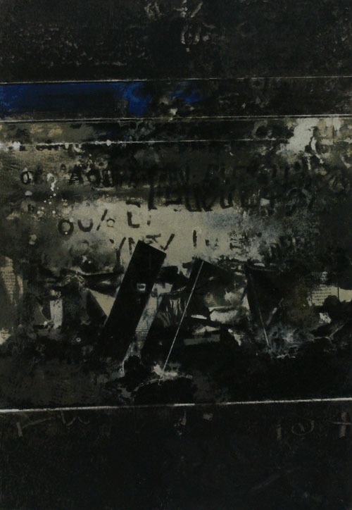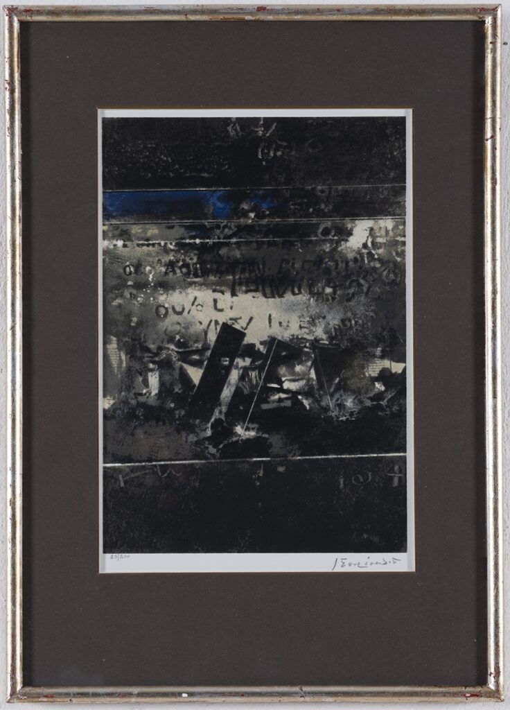 Evocative monochromatic composition, dominated by gray and black tones, while blue elements are also visible. The work gives the impression of a palimpsest, in which suggestive writing, points, graphics, traces, imprints, superimposed color interventions, pastings and “‘bright darkness’ can be distinguished” ‘.