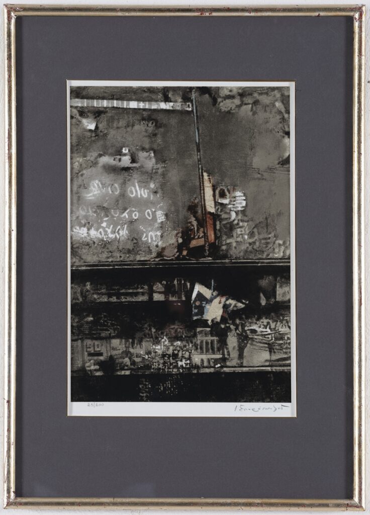 Abstract composition dominated by gray and black tones. The composition is divided horizontally into two unequal parts, of which the lower one is formed using black color. A world of mystery with original composition and structure. Symbols, points, numbers, letters and shapes with archetypal meaning constitute components of the composition, the space is transformed into an image of infinity.