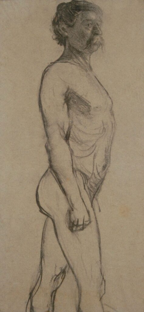 Depicts a naked male figure from the knees up in profile to the left. The head is rendered in a three-quarter view. The figure has a large mustache and thick hair. The face of the figure is also shaped with photo-shading, the rest of the body only by design.