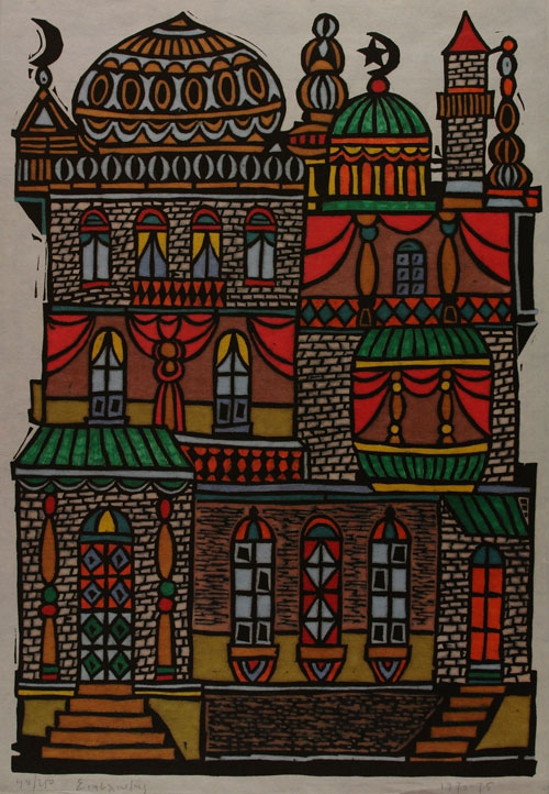 Turkish palace from the Shadow Theater is rendered with deliberate naivety, strong contours and colors, details, without perspective.