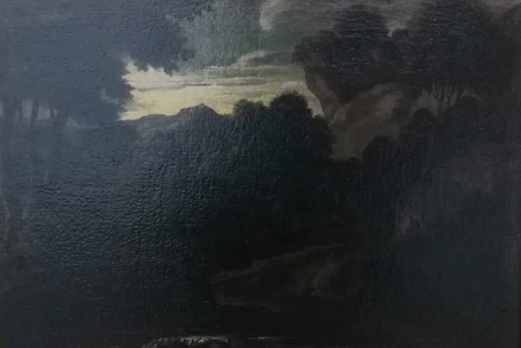 A wooded landscape with dense vegetation, tall trees and rocks is depicted in dark colors. Two houses are faintly visible on the right side.