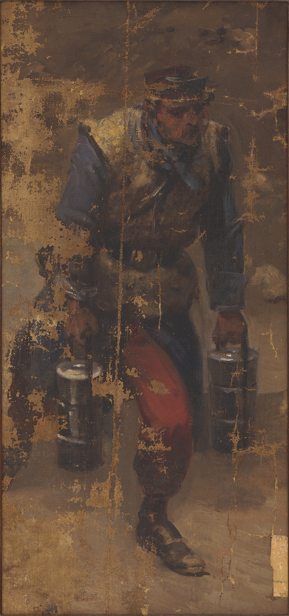 French infantry soldier in 3/4 view to right. The figure walks, its torso leaning slightly forward, due to the weight of the two metal containers of food or water it carries in each of its hands.