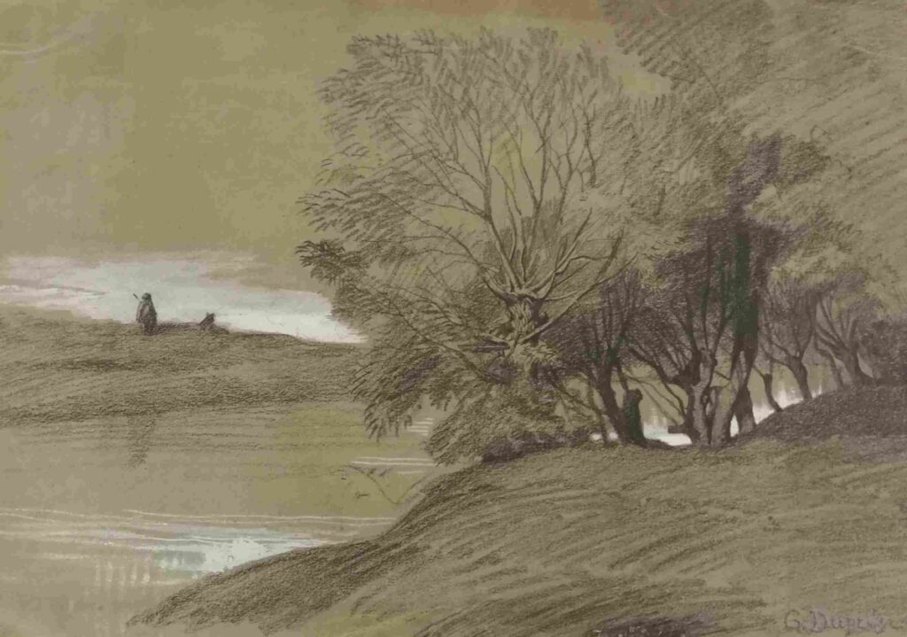 A river is depicted, on the left bank a figure and on the right a clump of trees. In the background sky and clouds reflected in the water.