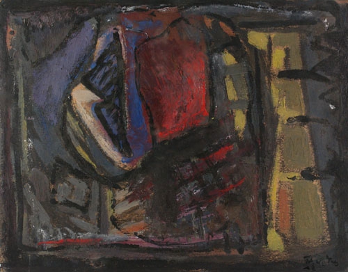Abstract composition in dark shades with thick, bold strokes. On a black background, a frame containing motifs in red, purple, green and olive colors is deleted.