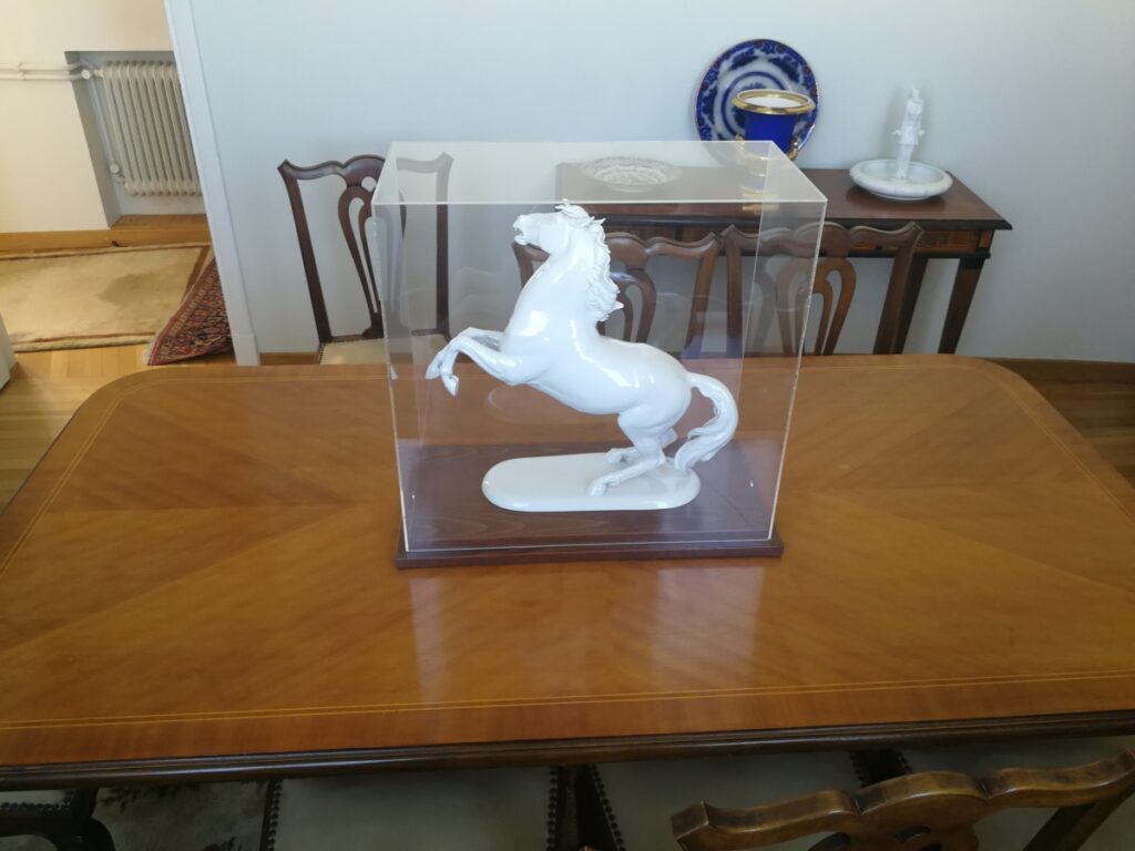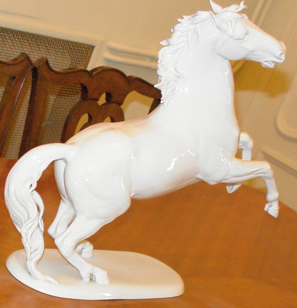 A galloping horse is depicted, with the two front legs raised, resting on the two hind legs bent. Mane and tail waving.