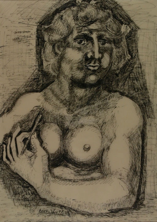 The figure is depicted naked, to the waist in a three-quarter view. She turns her head to the right while in her right hand she holds a quill resting on her left breast, commemorating her self-portrait process.