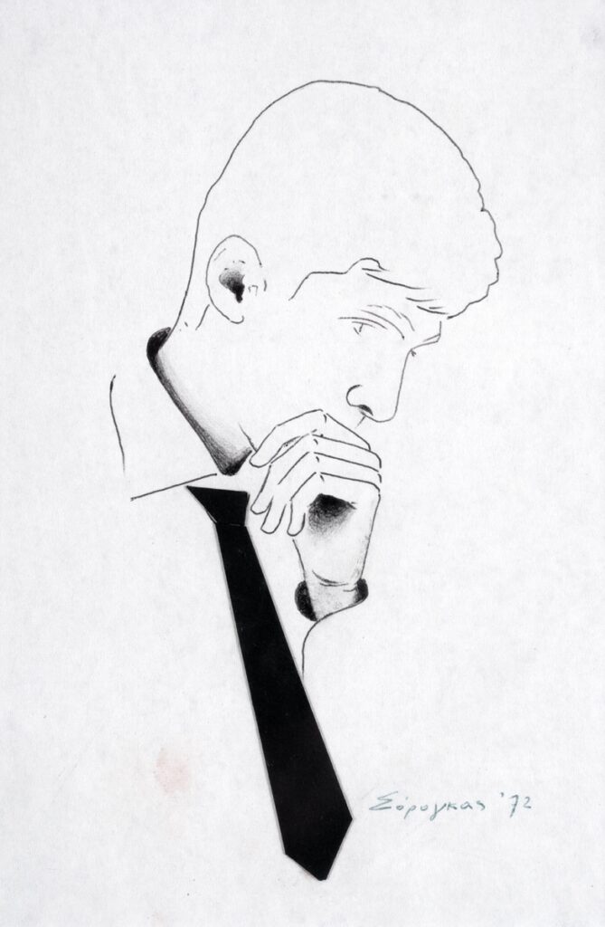 The figure is depicted at 3/4/ inclination to right, head bowed, resting on hand. The collar is emphatically emphasized, while the long black tie, rendered with black paper in a collage, predominates significantly. There is shading on the hand, neck and ear, while the head is roughly outlined.
