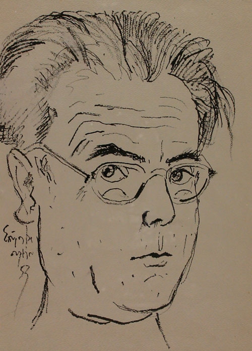 Self-portrait of the artist. He is depicted in bust, three-quarter view to the right. She wears glasses and her hair is slicked back. The form is rendered with rough lines, without shading. The design becomes more thorough in the eyes and hair, while in the rest of the features it is more free.