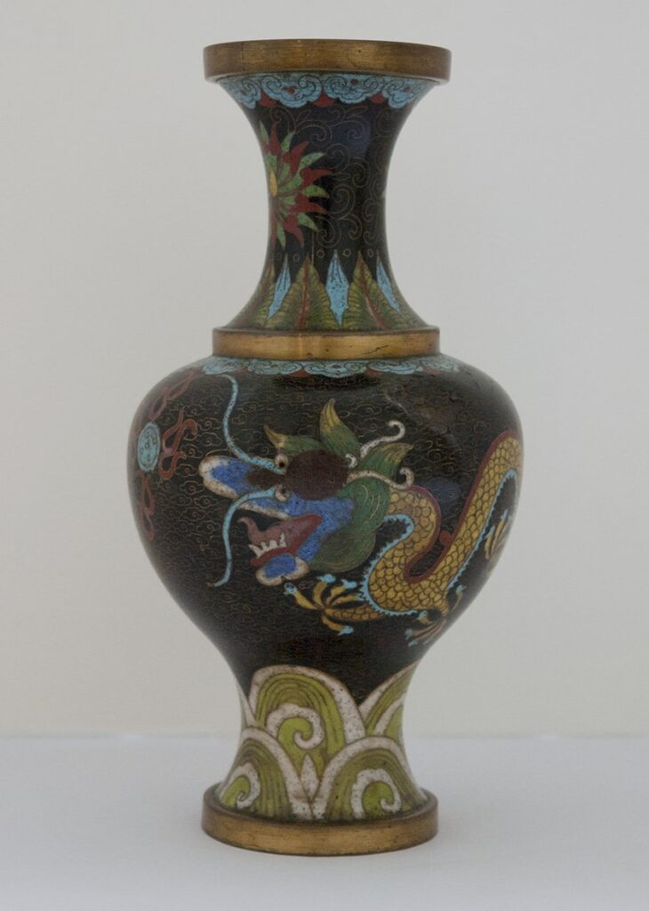 Vase decorated with facing dragons, plumes, leaves, clouds, flames, lotuses and symbols. Copper gilt ring on rim, neck and end of base.